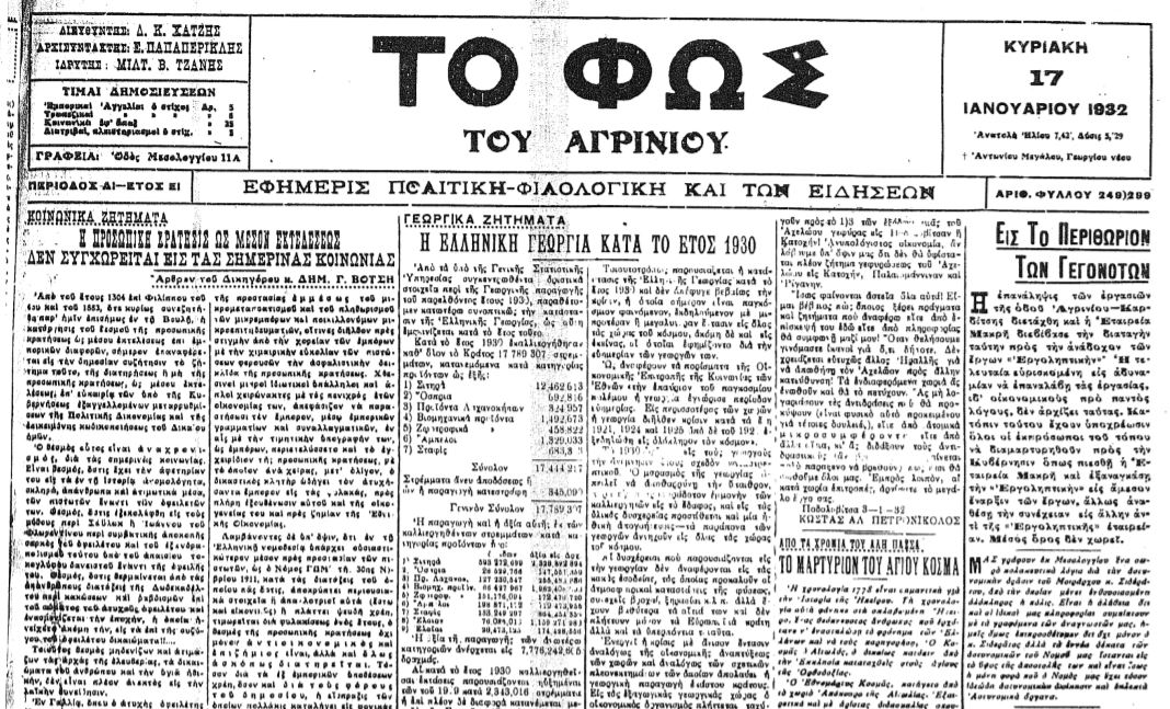 Η πρώτη σελίδα της εφημερίδας του Αγρινίου "Το ΦΩΣ" (17-1-1932)