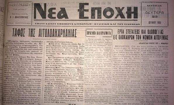 Πρωτοσέλιδο της εφημερίδας του Αγρινίου "Νέα Εποχή" (23-7-1951)
