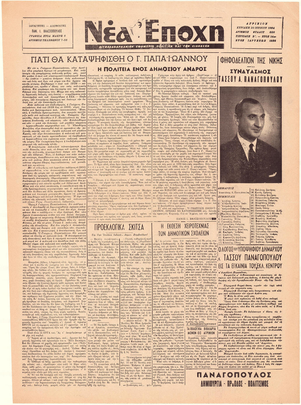 Πρωτοσέλιδο της εφημερίδας του Αγρινίου "Νέα Εποχή" (28-6-1964)