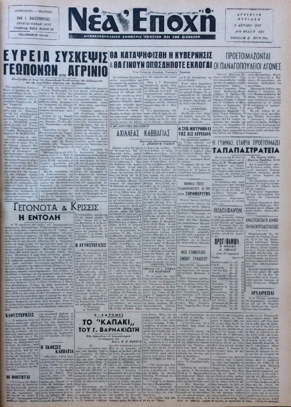 Πρωτοσέλιδο της εφημερίδας του Αγρινίου "Νέα Εποχή" (9-4-1967)