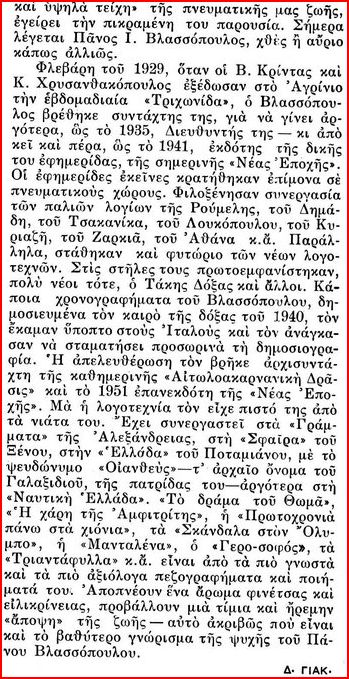 Είκοσι κιόλας χρόνια πέρασαν από τότε που ένας πολύτιμος φίλος και δάσκαλος έκλεισε για πάντα τα μάτια. Κι όμως, νομίζω πως κάθε φορά που βρίσκομαι στο Βραχώρι, θα τον ξαναδώ ολοζώντανο τον Πάνο Βλασσόπουλο, με την ψηλόλιγνη την κορμοστασιά του, με το αργό του το βάδισμα και με την καλοσύνη που ξεχυνόταν από το πονεμένο του πρόσωπο, το ήρεμο και στοχαστικό... Εκείθε μεριά, τον ανηφοράκο, μετά την μπιραρία του Κουτσούκη, κατά του Καλαμαρά το μαγαζί, στην «Απάνω πλατεία», δεξιά, είχε το γραφείο της «Νέας Εποχής» του, αντικριστά στο συμβολαιογραφείο του μακαρίτη Μαγκλάρα, όπου δούλευε τότε και ο αείμνηστος φίλος, συγγραφέας κι αγωνιστής Αντρέας Δ. Πολιτόπουλος. Ανέβαινες, θυμάμαι, μια ξύλινη εξωτερική σκάλα με φαρδιά σκαλοπάτια και κάγκελα, και στον πρώτο όροφο αντάμωνες τον 35άρη - τον προπολεμικό -Βλασσόπουλο, σκυμμένον μπρος στο γραφείο του να γράφει, να διαβάζει την εφημερίδα του, ντόπια ή αθηναϊκή, να σε χαιρετάει εγκάρδια και να σου παραγγέλνει καφέ! Ύστατη φορά που τον είδα, μετά τον πόλεμο και την κατοχή, ήταν στα «Παπαστράτεια» του 1970, όπου είχα μιλήσει κι εγώ για τους «Λυρικούς της Ρούμελης». Ανέβηκα βιαστικά, στο σπίτι του τώρα, πριν ξεκινήσω και πάλι για την Αθήνα, και -ο θεός μαρτυράς μου! - του είπα, με όλη μου την αυθορμησιά και την ειλικρίνεια, εκεί μπροστά στη γυναίκα του, την φιλτάτη μου Μαρία Κάνη, και στ' ανήλικα τότε παιδιά του: «Μου ήταν αδύνατο, δάσκαλε μου και πολύτιμε φίλε μου, να σκέφτομαι πως βρίσκομαι στο Βραχώρι και να μην ανέβω να σε δω και να σε χαιρετήσω...». Δεν του είχα πει τότε: «και να σε αποχαιρετήσω», γιατί δεν μπορούσα να βάλω στο νου μου πως σε λίγο καιρό, σε λίγους μόνο μήνες, θα τον αποχαιρετούσα για πάντα, από τις στήλες της «Παναιτωλικής» (Πέμπτη 27 Μαΐου 1971). Και πως το Γενάρη ίσια ίσια της ίδιας χρονιάς θα έστελνα στο ίδιο του το σπίτι, στη φαμελιά του, το παρακάτω τηλεγράφημα: «Δια θάνατον προσφιλέστατου μας Πάνου, υποδείγματος ανθρώπου και δημοσιογράφου, συλλυπούμεθα εγκαρδίως. Οικογένεια Δημητρίου Γιάκου». Ό,τι είχα να πω, τόσο για την πνευματική και την πολιτιστική όσο και τη δημοσιογραφική προσφορά, την πολύτιμη, του Πάνου Ι. Βλασσόπουλου στο Βραχώρι, το είπα στο «Αντί μνημόσυνου» σκιαγράφημά μου της «Παναιτωλικής» 27 του Μάη του 1971: «ΠΑΝΟΣ Ι. ΒΛΑΣΣΟΠΟΥΛΟΣ (1897-1971)». Πριν λοιπόν προχωρήσω στο τι είπαν κι άλλοι για τον αείμνηστο φίλο και δάσκαλο, ο κοινός μας φίλος λ.χ. Τάκης Δόξας και ο φίλος Γεράσιμος Παπατρέχας, θα αναφέρω απλώς τι διάβασα στην «Παναιτωλική» της Πέμπτης, 18 Μαρτίου 1971 για τα περιεχόμενα του φύλλου 32 (της 1ης Ιανουαρίου 1935) της «Νέας Εποχής», «Εβδομαδιαίας Εφημερίδας Αιτωλοακαρνανικών Συμφερόντων»: «Ιδιοκτήτης - Διευθυντής Π. Ι. Βλασσόπουλος». Δημάρχου Δημ. Βότση: «Ανασκόπησις επιτελεσθέντος έργου, ελπίδες δια το μέλλον». Μιλτ. Τζάνη: «το 1935 από καπνικής απόψεως». Ευχές του δημάρχου «επί τω Νέω Έτει» και των Ηλία Ηλιου (καπνεμπόρου) καπνοβιομηχανιών, Ν. Μαργαρίτη και Γ. Κεράνη, πρόσκληση για γενική συνέλευση των μελών του Συλλόγου Πολυτέκνων Αγρινίου (πρόεδρος Γεώργιος Γ. Σταυρόπουλος, γεν. γραμματεύς Δημ. Μπώκος) και φιλολογικές συνεργασίες «Πρωτοχρονιά στη φυλακή» Κ. Πασχαλίδη, «Μεσάνυχτα στο Λόγγο» Ευαγ. Τζωρτζοπούλου, «Άνθρωπος» Χάρη Φαφούτη, «Η Πρωτοχρονιά των Ταντάλων» Τάκη Γιάκου, «Φλόγες» Χρόνη-Ανθέμη και «Το Κυνήγι της Ευτυχίας» Α. Πολιτόπουλου. Χαρακτηριστικά όλα εκείνα τα κείμενα για το π
