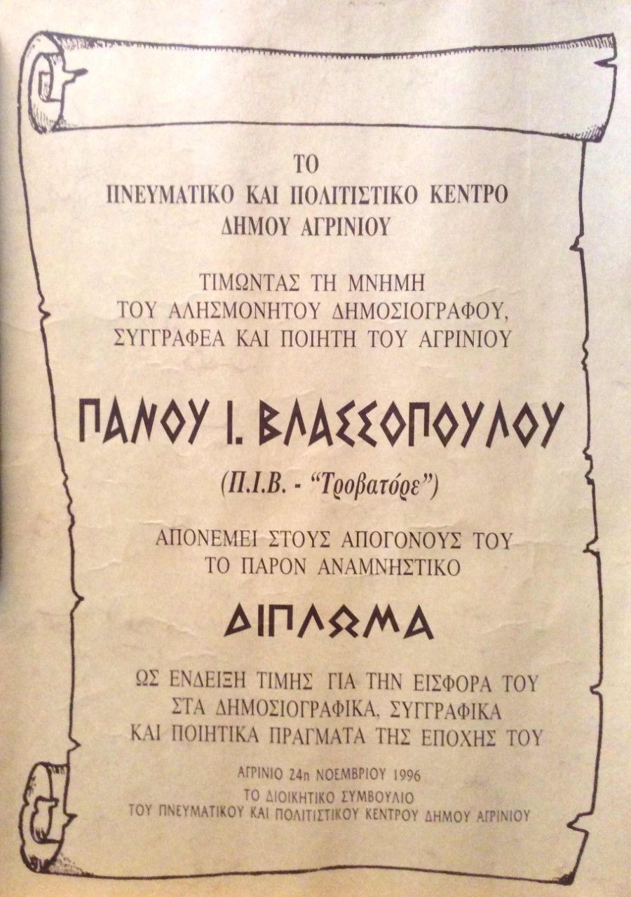 Αποτίμηση...Ένα κείμενο του Δημ. Γιάκου για τον Πάνο Βλασσόπουλο(Πρωτοδημοσιεύτηκε στο 10ο τεύχος του περιοδικού "Ρίζα" με τον τίτλο: "Πάνος Ι. Βλασσόπουλος, Δάσκαλος Ήθους και Γραφής")