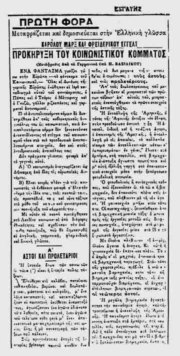 Η Εφημερίδα "Εργάτης" του Βόλου στην οποία καταχωρήθηκαν κείμενα του Κ. Χατζόπουλου, μεταξύ των οποίων και η μετάφραση του Κομμουνιστικού μανιφέστου