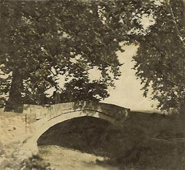Το ψηλογέφυρο, στο δρόμο απ’τ’ Αγρίνιο για τη Μεγάλη Χώρα, φωτογραφημένο μάλλον πριν το 1940. Κάπως έτσι το θυμάμαι και στη δεκαετία του ’60, πριν από την ανάπτυξη της πόλης. Φύσαγε πάντα ένα αεράκι εκεί κι είχε μία ανέλπιστα ανακουφιστική δροσιά μέσα στη σκόνη και στο κάμα του καμπίσιου καλοκαιριού, που ίδρωνε τα γύρω καπνοχώραφα κι ωρίμαζε τα σκάμνα, τα σύκα, τα σταφύλια, τα καπνά και μιαν ασυνείδητη επιθυμία να φύγουμε γι’ αλλού. Κελάρυζε ακόμη τότε καθαρό νερό κάτω απ’ το βαθύ ίσκιο των δυο μεγάλων πλατάνων, φορτωμένων με κελαηδισμούς πουλιών, πάνω απ’ τα βατράχια που μαζί με την επιμονή των τζιτζικιών συγκρατούσαν το ίσο του ψαλμού. Με το που πέρναγες το γεφύρι, ένα ασβεστωμένο τοσοδά καφενεδάκι έδινε καφέ, ουζάκι ή καν’αναψυκτικό δροσερό, όταν είχε πάγο. Δυο τρία τραπεζάκια μέσα και δυο έξω, μόνο. Το κράταγε ο πατέρας Μπαρχαμπάς. Οι αγωγιάτες σταματούσαν κι άφηναν παραδίπλα τα σκονισμένα κάρα τους με τα άλογα λαχανιασμένα να ξαποστάσουν και να δροσιστούν. Τα τάιζαν κάποιες φορές κριθάρι ή άχυρο μέσα σε σακούλια που κρεμούσαν μπροστά στο στόμα τους κι έτρωγαν, σάμπως κρυφά, λοξοκοιτώντας. Πρώτη φορά που μπήκα διστακτικός, μικρό παιδί, είδα, δεξιά μου στον μέσα τοίχο, ζωγραφισμένη μια γοργόνα. Άστραφταν λαμπερά σαν ιδρωμένα τα φωτεινά της χρώματα στον παλίμψηστο ασβέστη, μαγεύτηκα• ούτε που τόλμησα να ξανακοιτάξω το ξωτικό, βγαίνοντας με τη λεμονάδα στο χέρι. Σ΄ αυτό το γεφύρι, σ΄ αυτό το ρέμα και στα γύρω χωράφια έπαιζα τα καλοκαίρια κι ακόμα εκεί θυμάμαι τον παράδεισο, την άφεση στην άπλα του χρόνου, στον χωματόδρομο της ζωής. Δόξα τω Θεώ, λέω, που τα πρόλαβα και τα έζησα, αργοπορώντας, λίγο πριν τα σκεπάσει η σκόνη κι η βιαστική εξάπλωση των σκουπιδιών της προόδου που μας αποπλανούσε, με τα καλά της, μακρυά τους.