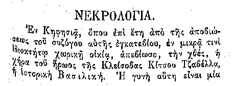Χαρακτηριστική είναι η παρακάτω καταχωρούμενη νεκρολογία που δημοσιεύτηκε στο περιοδικό "Έσπερος" (τεύχος 23 του Α τόμου) που εκδίδονταν στη Λειψία
