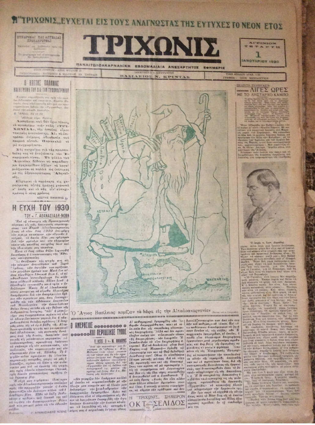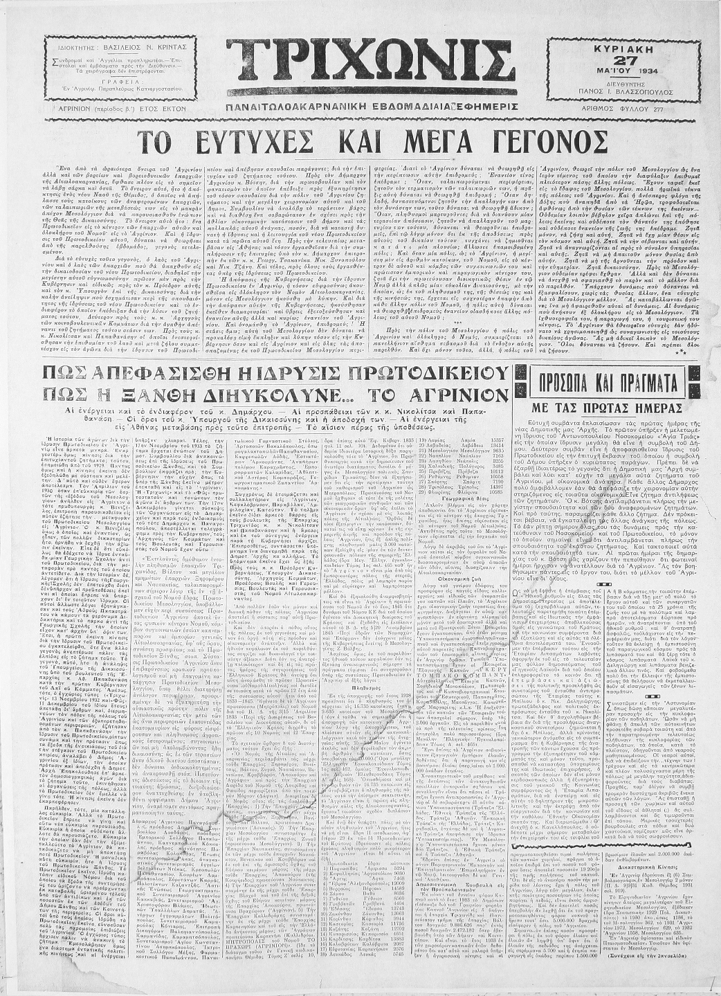 Πρωτοσέλιδα της εφημερίδας του Αγρινίου "ΤΡΙΧΩΝΙΣ" (1929 - 1934)