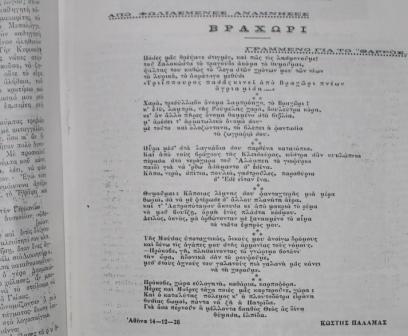 Πόσες μᾶς θρέψανε στιγμές, καὶ πῶς τὶς λησμονοῦμε! Τοῦ Ζαλοκώστα τὸ τραγούδι ἀκόμα τὸ θυμοῦμαι, ψάλτης του καθὼς τό ῾λεγα στῶν χρόνων μου τῶν νέων τὸ λυρικό, τὸ ἀκράταγο μεθύσι: «Τριίππουρος πασὰς κινεῖ ἀπὸ Βραχώρι πνέων ἄγρια μίση …». Χαρά, τρισύλλαβο ὄνομα λαμπρόηχο, τὸ Βραχώρι! κ᾿ ἐσὺ λαμπρή, τῆς Ρούμελης χαρά, δουλεύτρα κόρη, κι᾿ ἂν ἄλλο πῆρες, ὄνομα θαμμένο στὰ βιβλία, μ᾿ ἀρέσει τ᾿ ἀρματωλικὸ ὄνομά σου μὲ τοῦτο, καὶ ὁλοζώντανη, τὴ βλέπει ἡ φαντασία τὴ ζωγραφιά σου. Ηὗρα μές᾿ στὰ λαγκάδια σου παρθένα κατατόπια. Καὶ ἀπὸ τοὺς βράχους τῆς Κλεισούρας, κάστρα σὰν κυκλώπεια πέρασα στὰ νερόχαρα τοῦ Ἀλάμπεη τὰ γιοφύρια παιδὶ γιὰ νὰ ῾ρθῶ ἀσήμαντο σ᾿ ἐσένα. Κῆποι, νερά, σπίτια πουλιά, γαστροῦλες, παραθύρια σ᾿ Ἐσὲ ἦταν ἕνα. Θυμοῦμαι: Κάποιας λίμνης σου φανταχτερῆς μία μέρα θωριά, σὰ νὰ μὲ φτέρωσε σ᾿ ἄλλου πλανήτη ἀέρα, καὶ τ᾿ Ἀσπροπόταμου ἄκουσα κι ἀπὸ μακριὰ τὸ ρέμα νὰ μοῦ βουίζη, ὁρμὴ ἑνὸς πλάστη κόσμου. Δειλός, ὀκνός, μὰ ὀρθώνονταν μὲ ξαναμμένο τὸ αἷμα τὰ νιάτα ἐμπρός μου. Τῆς Μούσας ὑποτακτικός, δικούς μου ἀνοίγω δρόμους καὶ δένω τὶς ἀγάπες μου στῆς ἁρμονίας τοὺς νόμους. -Πρόκοβε, γῆ, πληθαίνοντας τὸ γνώριμο βοτάνι, τὴν ὥρα, ἡδονικὰ σὰν τὸ ροφοῦμε, μές᾿ στοὺς ἀχνούς του γαλανοὺς πιὸ γαληνὴ μᾶς κάνει νὰ τὴ χαροῦμε. Πρόκοβε, χώρα εὐλογητή, καθάρια, καρποφόρα. Μέρες καὶ Μοῖρες τάχα ποιὲς μᾶς καρτεροῦνε, χώρα; Καὶ ὁ καταλύτης πόλεμος κι᾿ ἡ πλουτοδότρα εἰρήνη θυσίας βωμοί, πάντα νὰ ζεῖ ἡ Πατρίδα. Γιὰ ὅσα περνοῦν ἢ μέλλονται βοηθὸς Θεὸς ἂς δίνῃ θύμηση, ἐλπίδα. Γραμμένο γιὰ τὸ «Θάρρος». Ἀθήνα, 14-12-1926